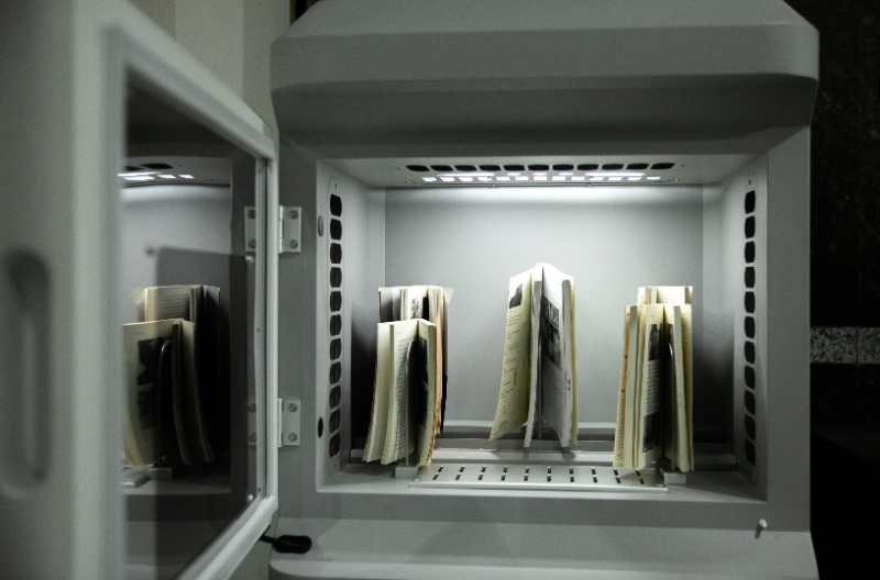 阅动图书杀菌机采用紫外线杀菌技术,30秒消毒,可同时完成5本图书的消毒,提供气旋式逐翻动书页的功能,对书封及内页做到全方位消毒杀菌,采用二级(双重)过滤系统,不仅可以消毒杀菌,祛除书中的霉味等异味,并且可以滤除甲醛等有机污染性气体,同时搭配天然香精,使得图书具有书香气息;读者可通过柜门上安全抗UV材质透视窗观察到杀菌过程。