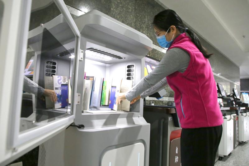 放置在育英图书馆一楼大厅的图书自助借还机旁边 北校区图书馆二楼大厅