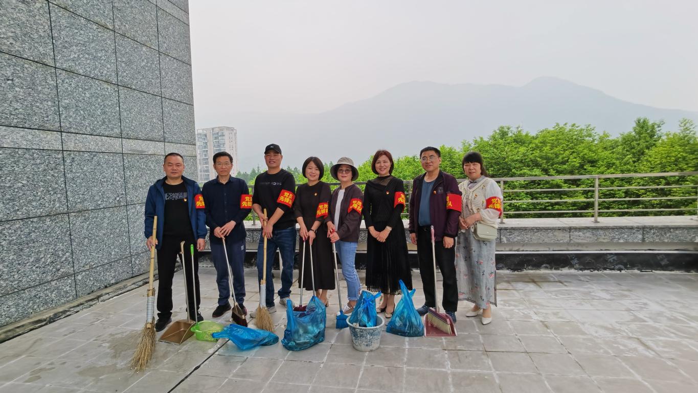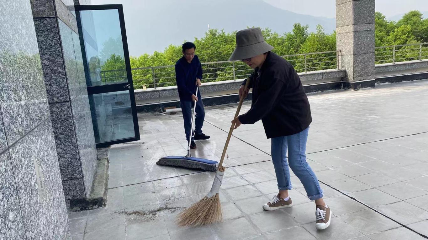 2022年4月22日上午,图书馆第四党支部全体党员开展党日志愿服务活动,对古籍阅览室外天台的卫生进行了彻底清理。