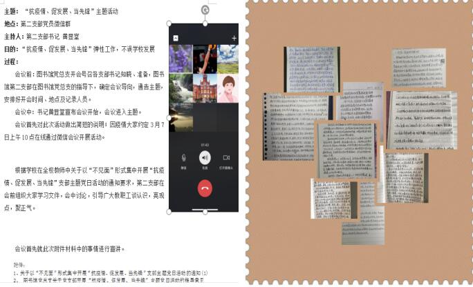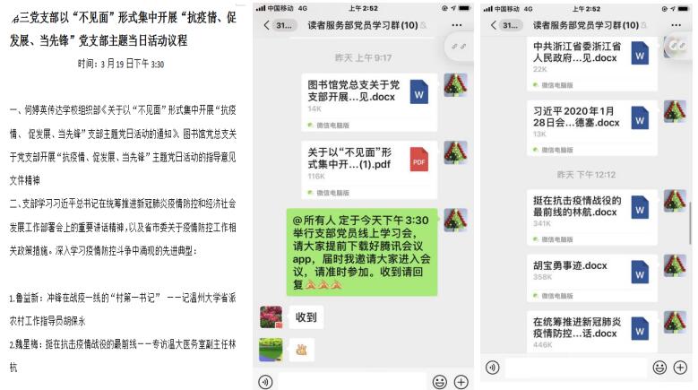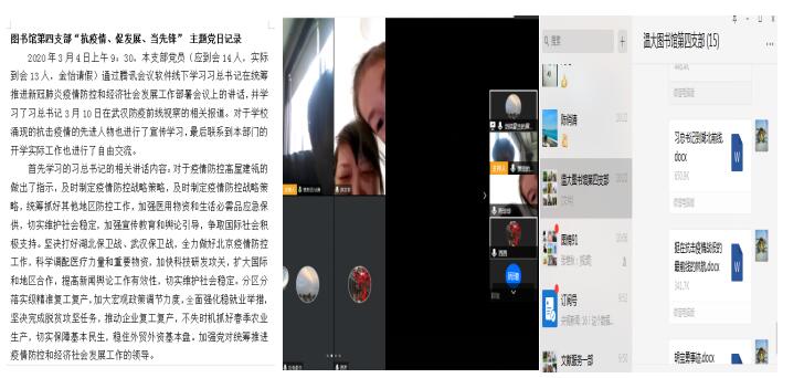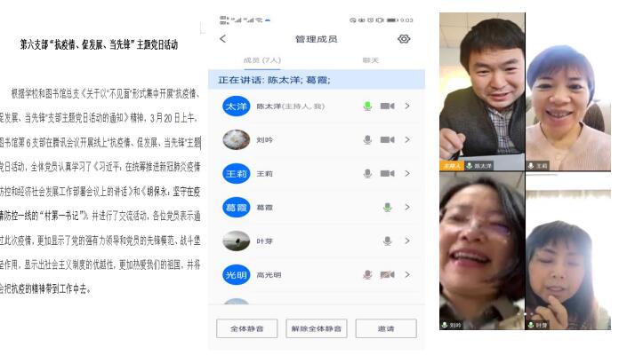 为深入贯彻中央和省市委关于统筹推进疫情防控和经济社会发展工作的系列决策部署,实现“两手抓、两手硬、两战赢”目标,结合学校实施“弹性工作制”,开展“互联网+教学”“互联网+办公”相关举措,图书馆制定了各党支部“不见面”形式开展“抗疫情、促发展、当先锋”主题党日活动的指导意见,及时指导各支部通过线上形式开展活动。