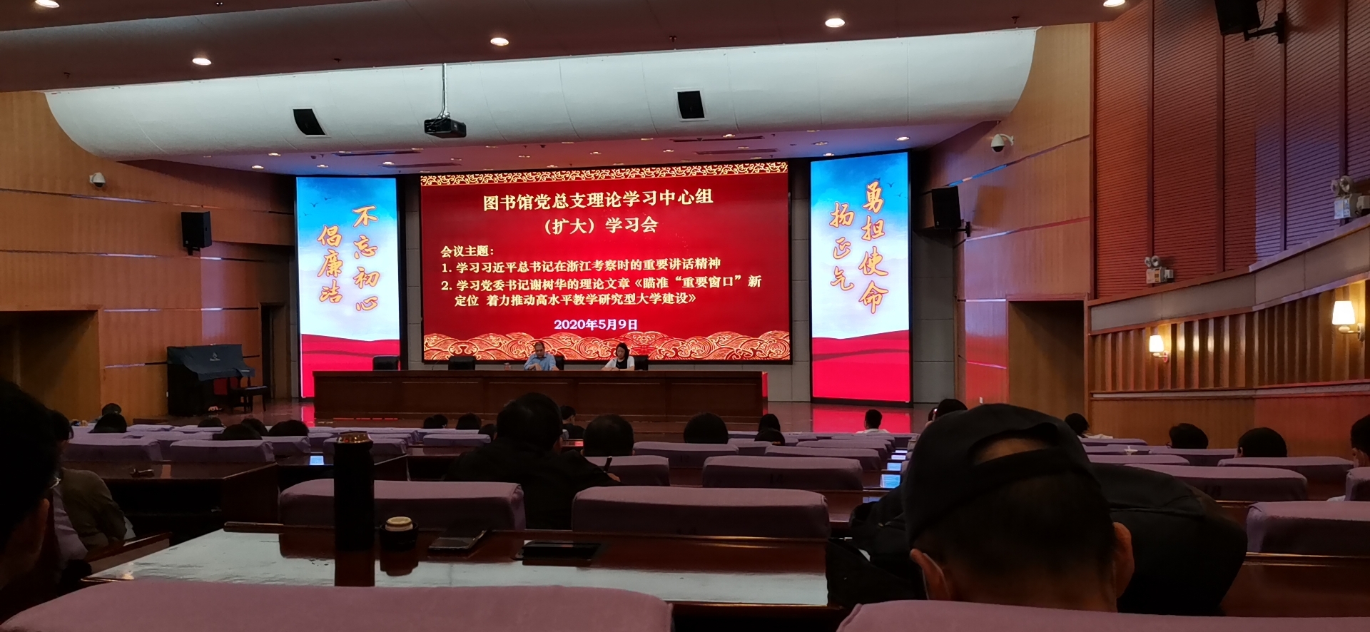 2020年5月9日,图书馆党总支召开理论学习中心组(扩大)会议,学习习近平总书记在浙江考察时的重要讲话精神及党委书记谢树华的理论文章《瞄准“重要窗口”新定位 着力推动高水平教学研究型大学建设》。陈安金馆长主持会议,全馆职工80余人参加会议。