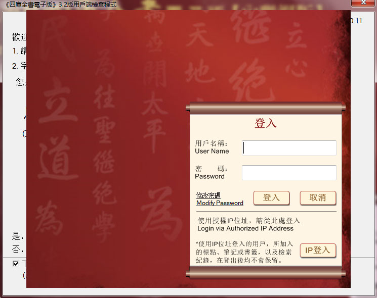 我校购买的文渊阁四库全书内联版(有限制同时只允许1人在线,校内IP直接登录,推荐使用,版本较新)和四库全书旧版(用户名和密码登录,有限制同时只允许2人在线,详情请垂询86689683)只限于校内读者使用。