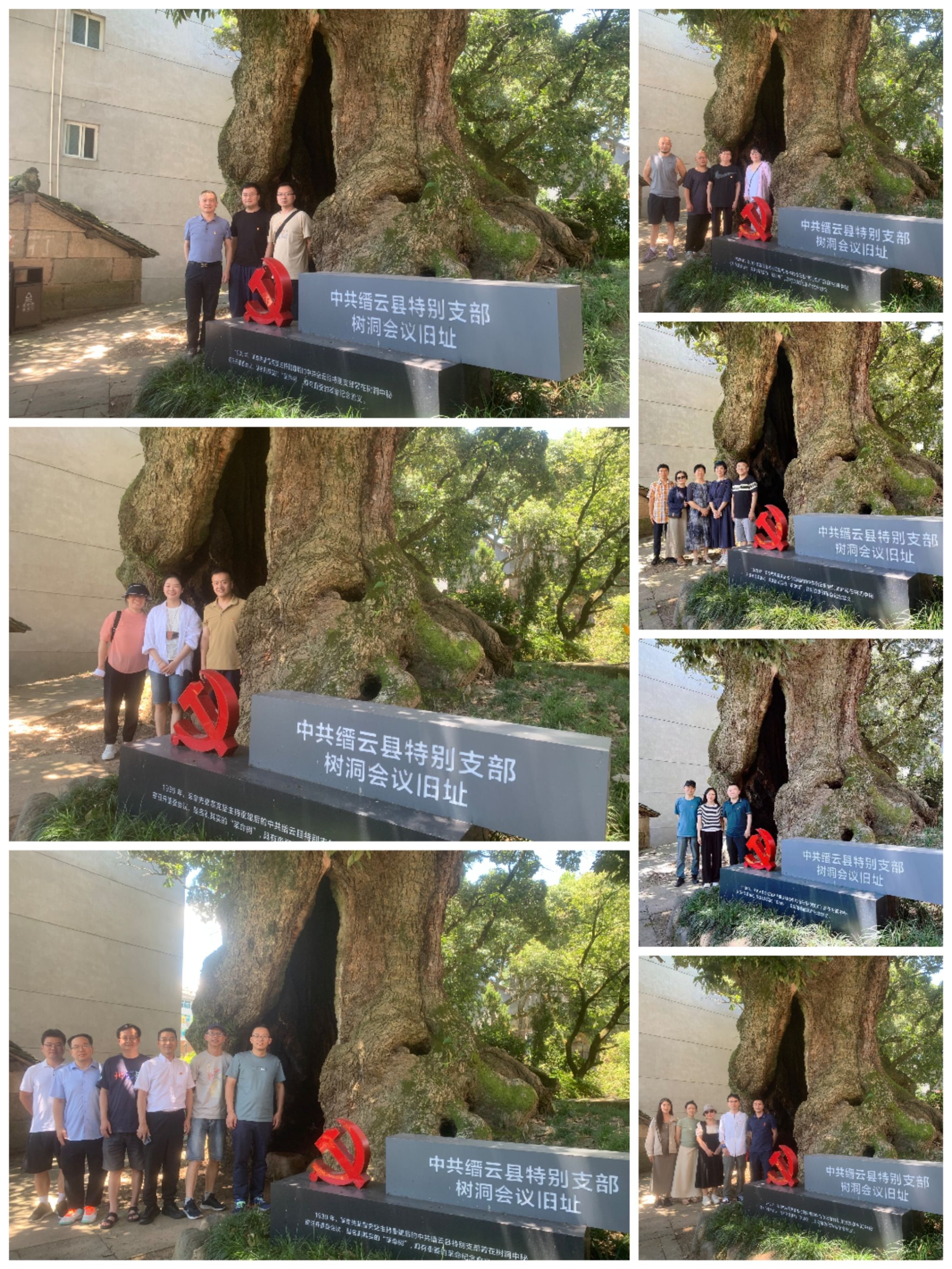 沿着石阶,党员们来到双溪口村的古树公园,驻足参观了中共缙云县特别支部树洞会议旧址,感叹一颗千年古树,见证一段烽火岁月。据考证,1939年,中共缙云县特别支部书记雷克坚,主持中断重建后的中共缙云特别支部第一次会议,秘密在双溪口村可容纳数人的苦槠树洞内召开,让革命种子在此落地生根,从此拉开缙云县共产主义运动不断壮大的序幕。