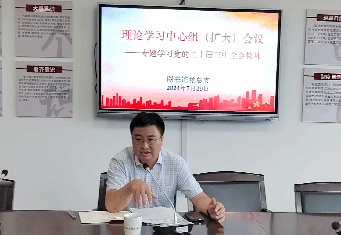 7月29日上午,图书馆在B201会议室召开党总支理论学习中心组(扩大)会议,传达学习贯彻党的二十届三中全会精神。会议由馆长、党总支书记孙良好主持,图书馆党总支委员、党支部书记及各部门主任参会。