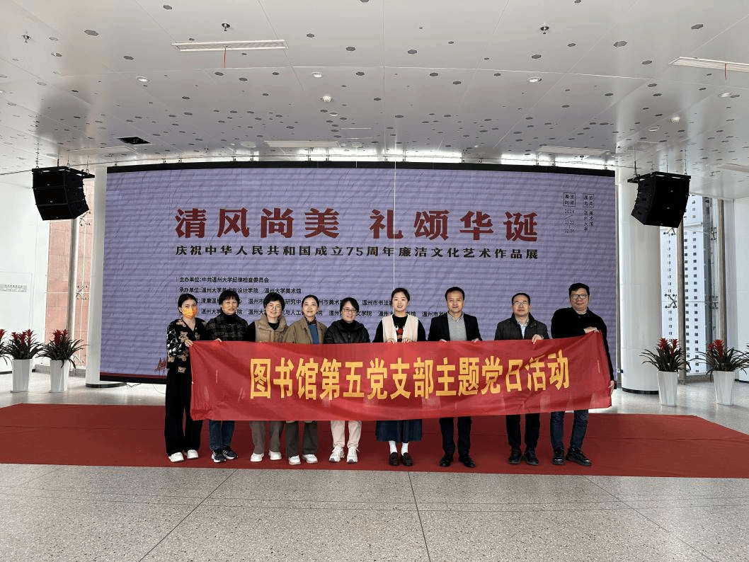为落实“罗山清风・第十六届校园廉洁文化月”工作要求,深入推进党风廉政建设,图书馆第五党支部全体成员于11月29日上午前往温州大学美术馆,参观“清风尚美,礼颂华诞”庆祝中华人民共和国成立75周年廉洁文化展。
