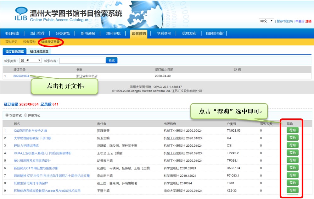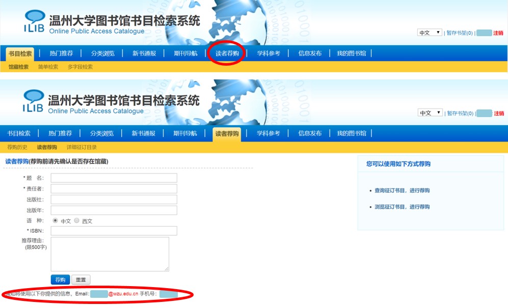 图书荐购请访问http://lib.wzu.edu.cn/index.htm的“交流互动”下的“书刊荐购”填写书刊信息,提交即可。推荐购买的书刊订购相关信息会发送到您的邮箱中。