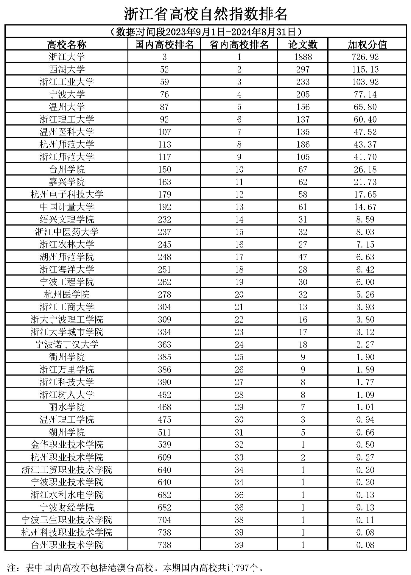 浙江省高校自然指数排名(2023年9月1日-2024年8月31日)