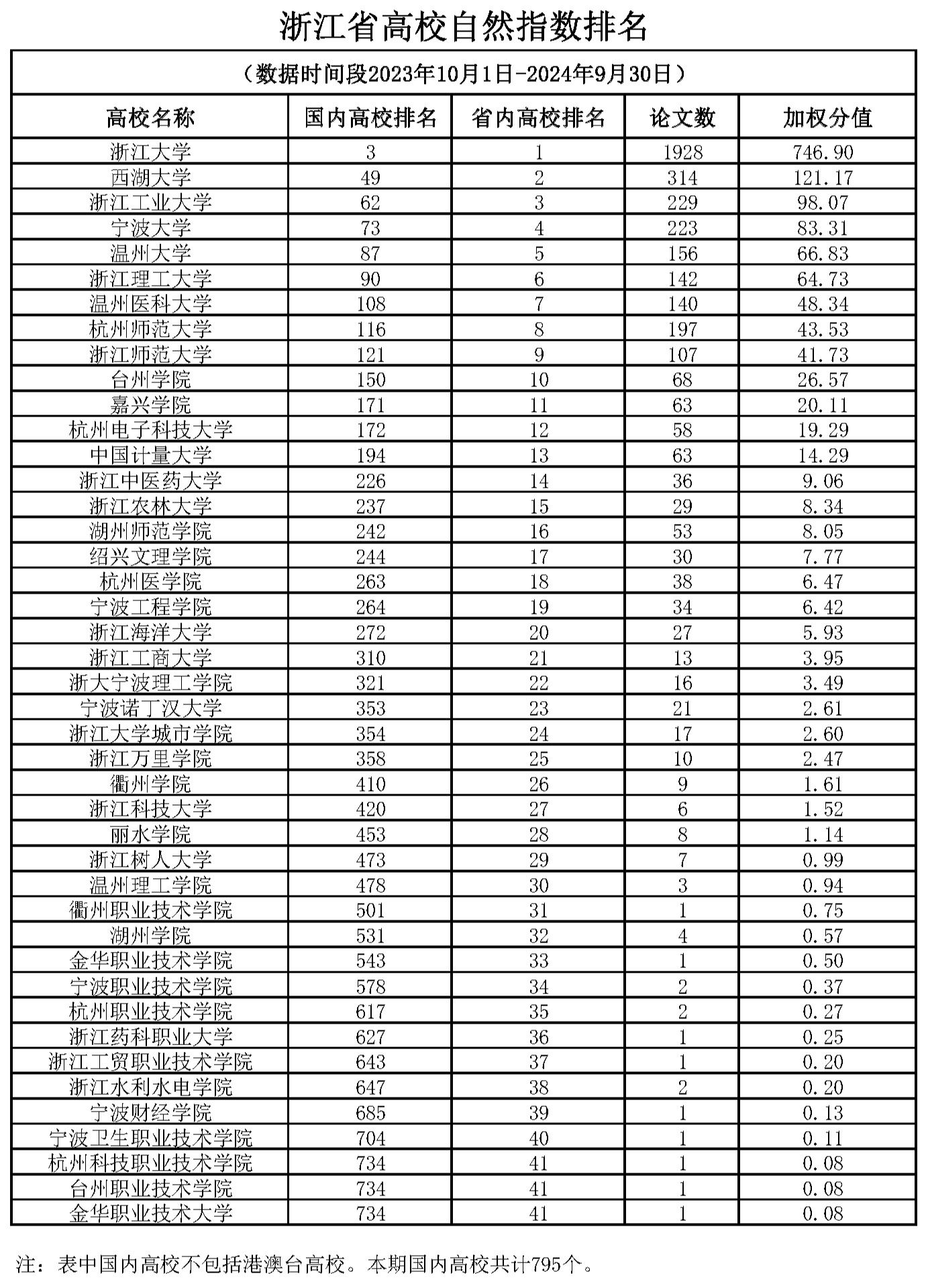 浙江省高校自然指数排名(2023年10月1日-2024年9月30日)