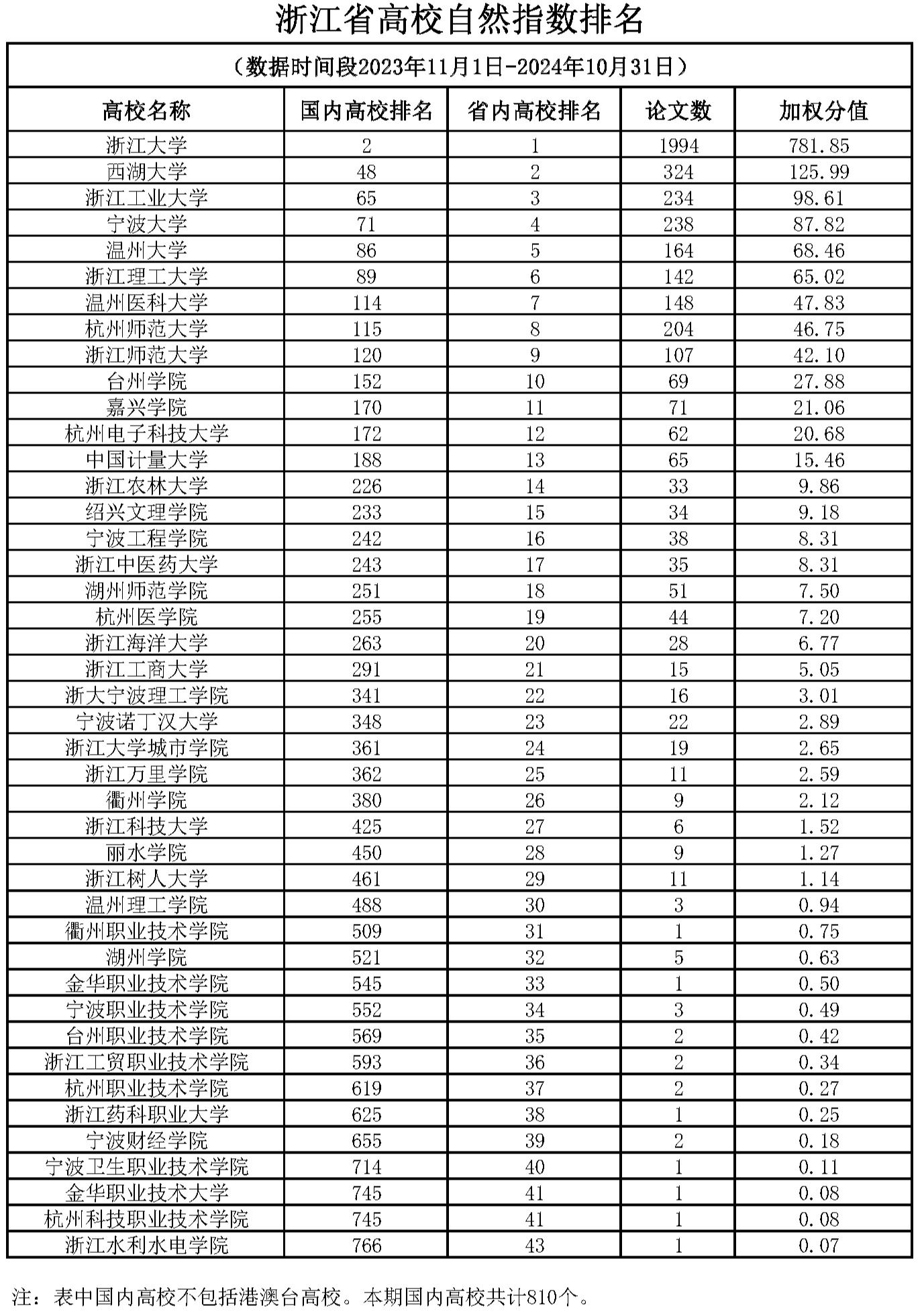 浙江省高校自然指数排名(2023年11月1日-2024年10月31日)