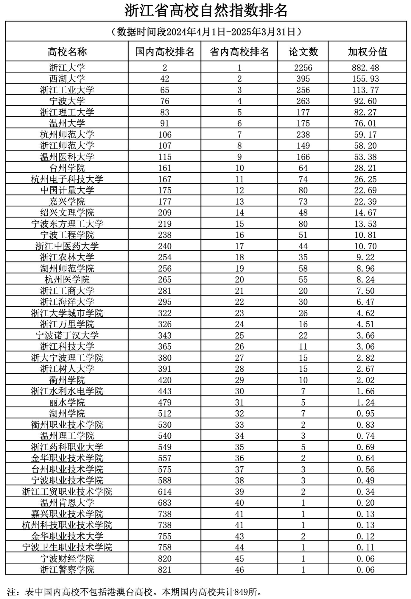 浙江省高校自然指数排名(2024年4月1日-2025年3月31日)