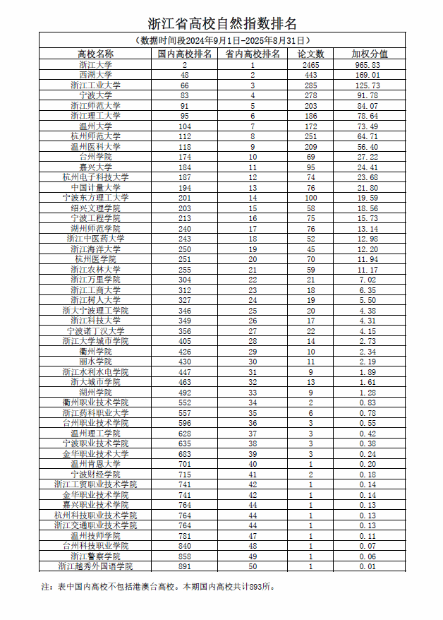 浙江省高校自然指数排名(2024年9月1日-2025年8月31日)