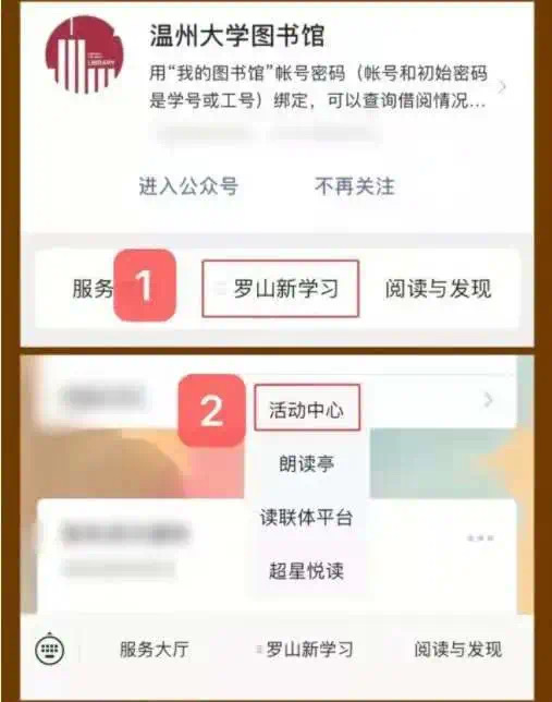 进入温州大学图书馆微信公众号,点击“罗山新学习”栏目,选择“活动中心”,点击“摄影技巧与实践”并进行报名即可。详见右图: