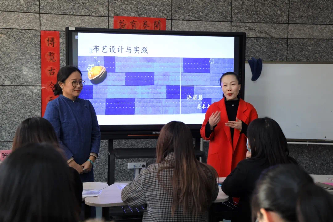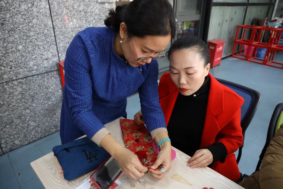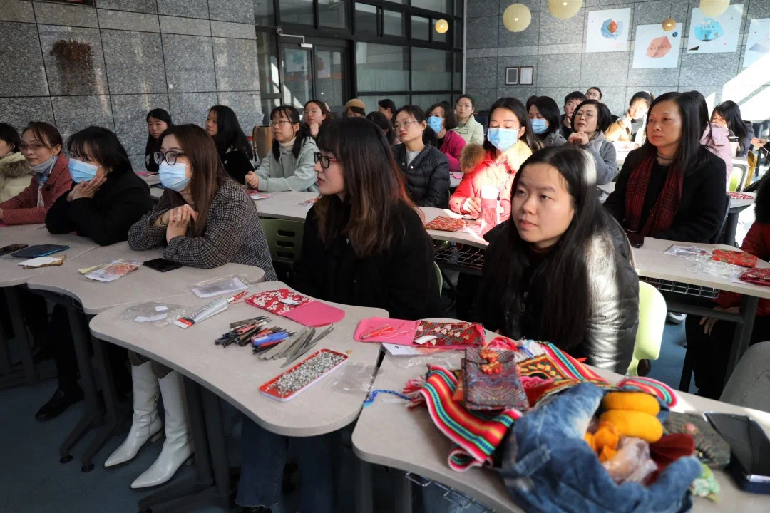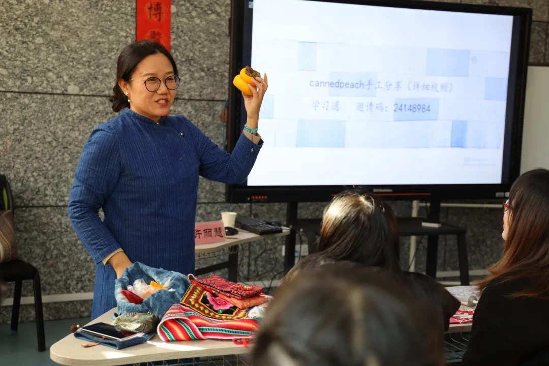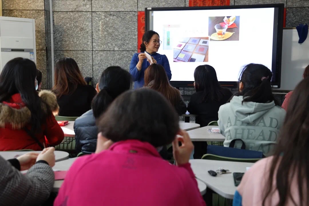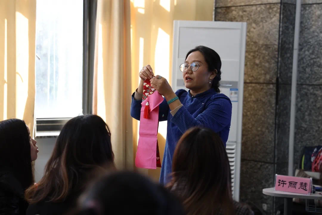 活动现场,许老师耐心的从基本针法教起,详细介绍了平针、全回针、半回针的针法与作用。播放提前录制好的缝制红包视频,细细的讲解本次活动——红包袋缝制方法。