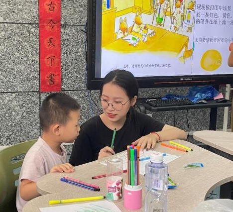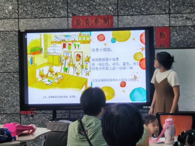 接着小商老师让小朋友们模拟绘本中的一幅小场景,孩子在志愿者的陪同下画出心目中的幼儿园。之后,小朋友们踊跃上台和大家分享自己的绘画作品。