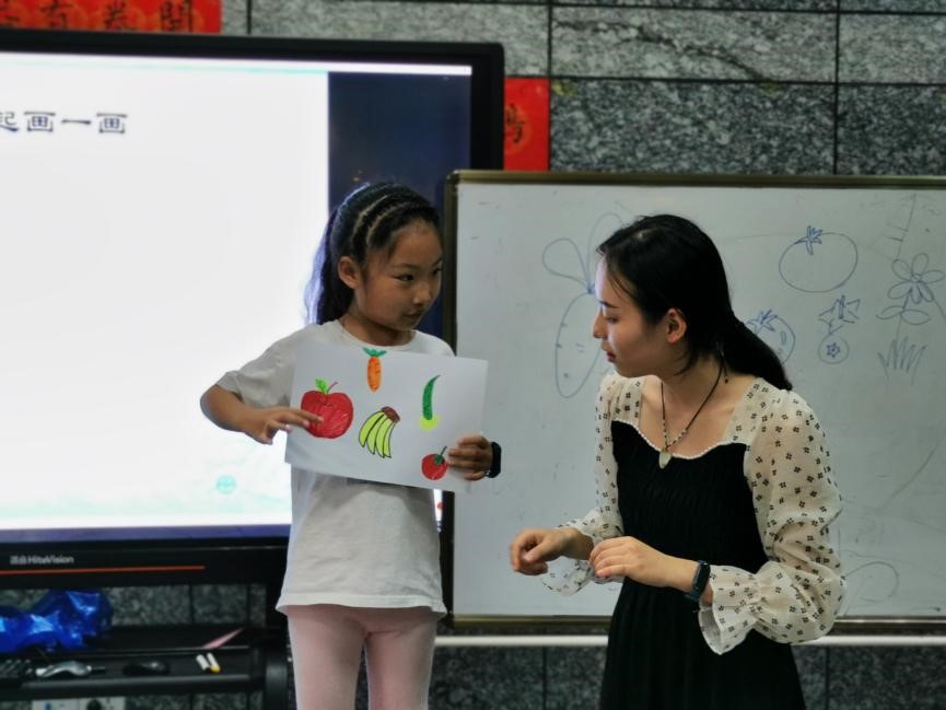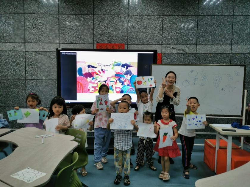 在绘本活动中,孩子时而变成大侦探,研究阿婆都去了哪里;时而又变成小老师,给大家介绍自己喜欢吃的水果和蔬菜;最后还变成小画家,跟着小徐老师一起画出了美丽菜园和瓜果蔬菜……