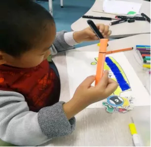 游戏环节,小于老师请志愿者们分发提前准备好的细菌贴纸,贴纸背面还写上了数字,让三个小朋友分别拿出一张贴纸念出背后的数字(如679),并让其他小朋友倒着重复刚才的数字(976),培养孩子的注意力和思维活跃度。孩子们还将贴纸贴到白纸上,学有余力的小朋友自行发挥了一番,画了各种想象中的细菌模样。