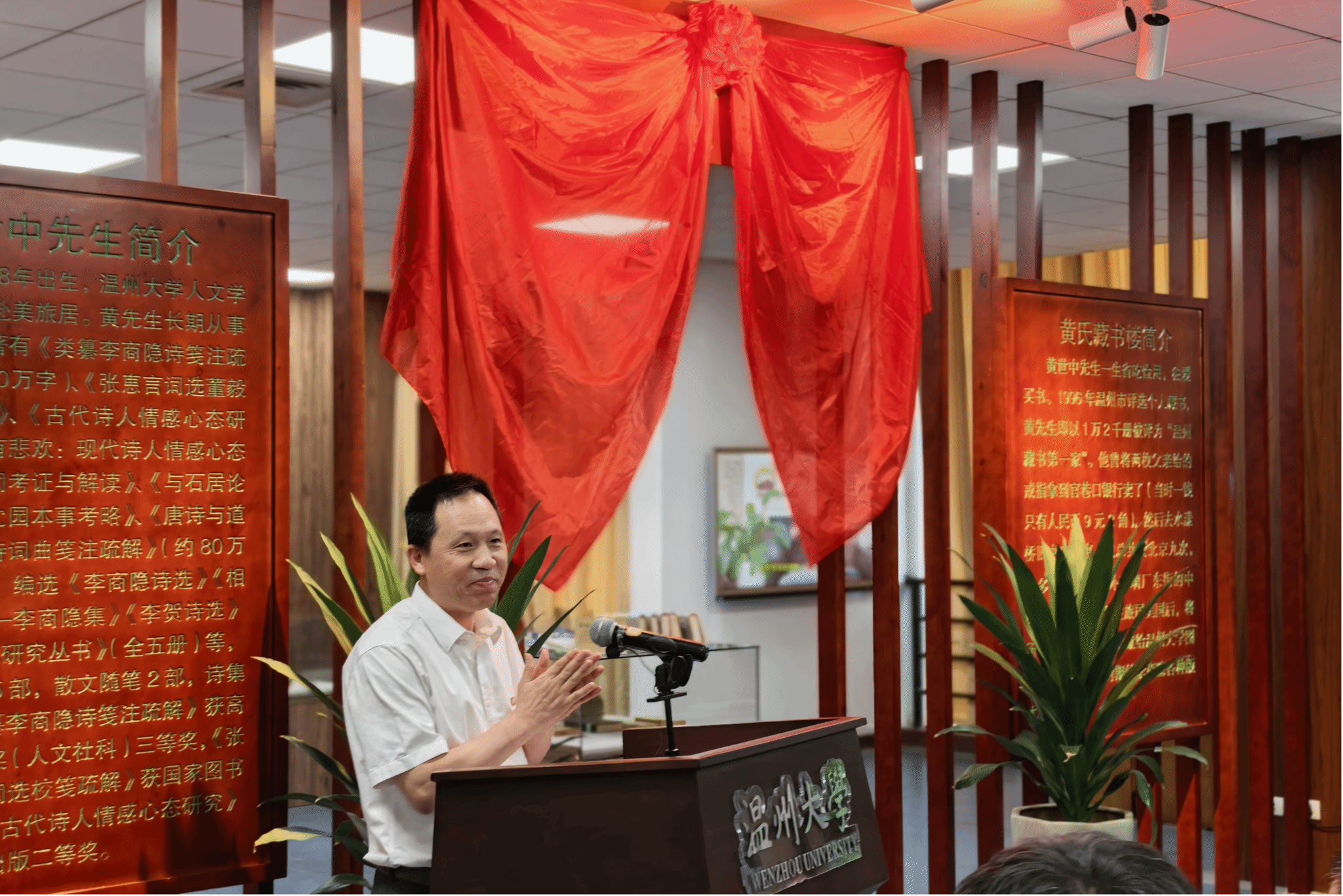 仪式由图书馆副馆长周志峰主持。他介绍,黄氏藏书楼落成得益于黄世中先生慷慨捐赠两万余册典籍,尤以李商隐研究文献最为系统珍贵;同时,图书馆还接受中国美术学院出版社赠书768种834册,以及马大康、陈增杰、王手、东君等学者作家的手稿,丰富了学校特藏资源体系。