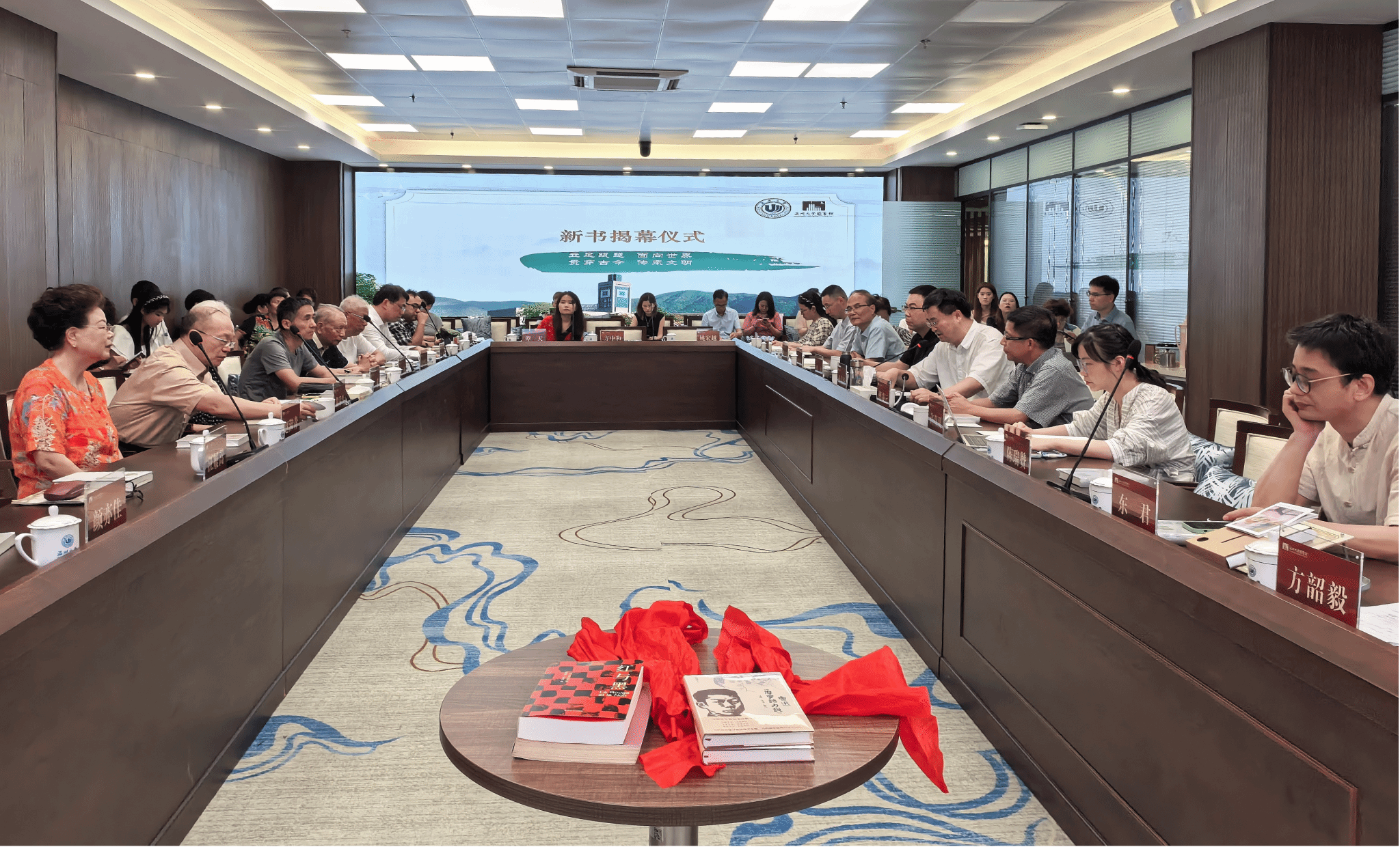 来源:图书馆 作者: 发布时间:2025-06-27 浏览次数:[ ]次6月25日下午,赵瑞蕻先生重版新书分享会在温州大学育英图书馆A406室隆重举行,赵瑞蕻先生次女赵蘅、草婴读书会北京分会会长张钊、北京鲁迅博物馆原常务副馆长黄乔生、温州市文联秘书长曹凌云、温州大学人文学院教师代表、出版社代表及赵瑞蕻先生亲属好友等嘉宾,与师生读者齐聚一堂,共同纪念这位温州籍著名诗人、翻译家、学者诞辰110周年,品读重版的《鲁迅〈摩罗诗力说〉注释·今译·解说》与《红与黑》,见证经典著作焕发时代生机。活动由温州大学图书馆馆长孙良好教授主持。